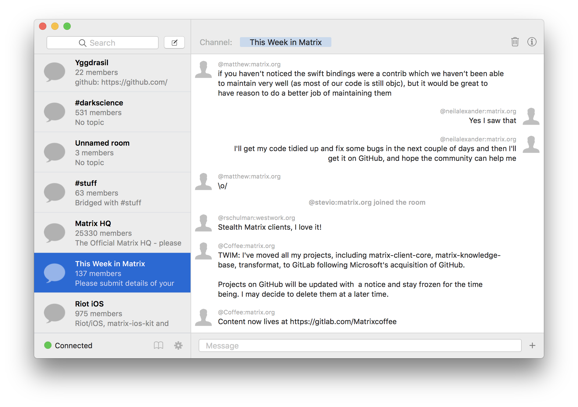 On the subject of libQMatrixClient, it's exciting that Konversation, the KDE IRC client, may in future start to use libQMatrixClient for Matrix support!