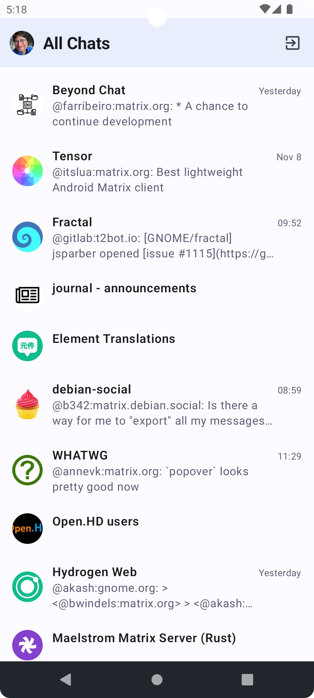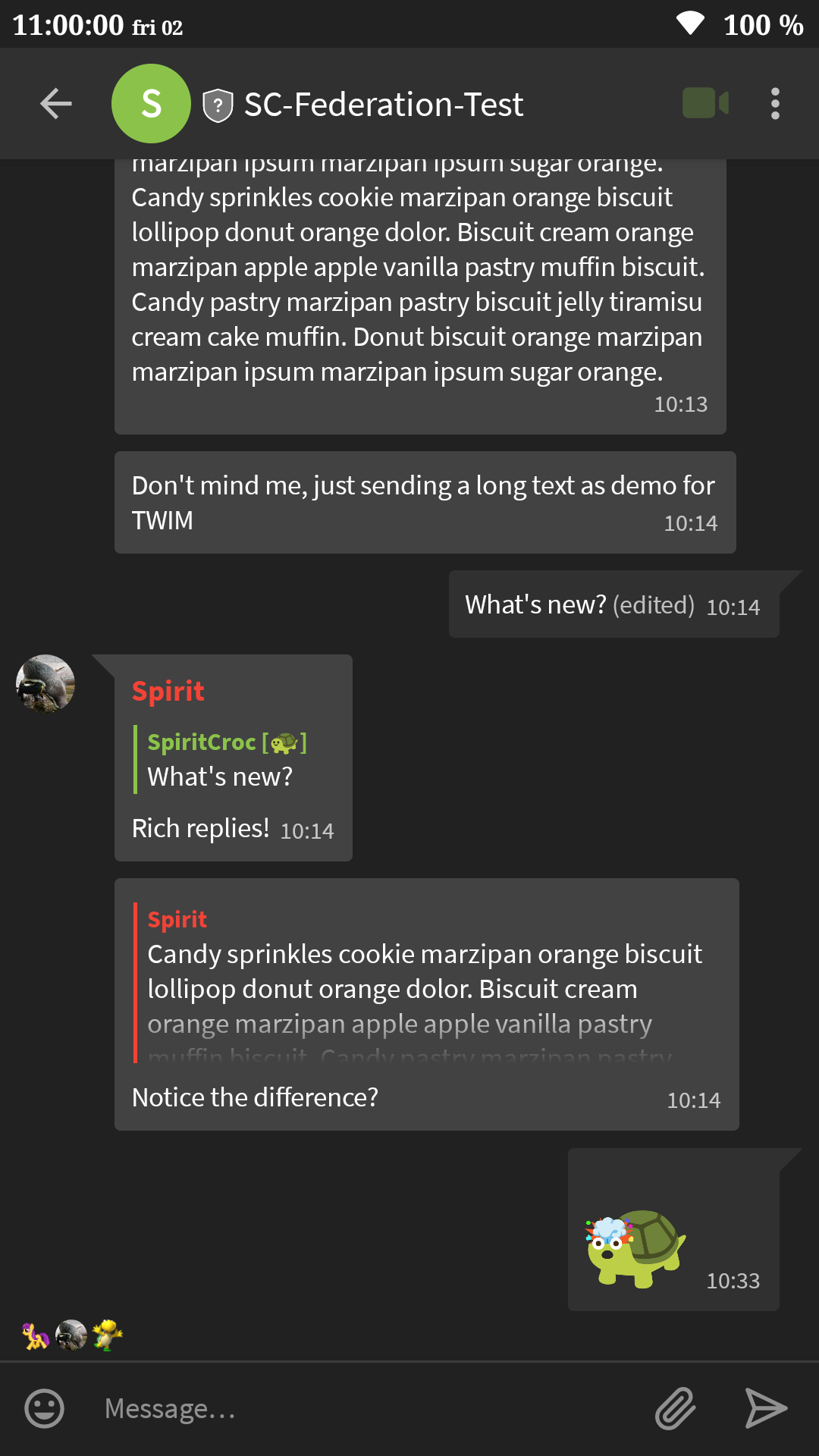 On the app itself, we have spent a lot of time on getting the chat right. The appβs core was upgraded to matrix-sdk 0.6+ to get the latest timeline API in, which required quite some refactoring. But allowed us to implement reactions, edits and replies. Encrypted Messages are still somewhat unreliable though. Prior to the nightly builds weβve also taken some time to clean up the UI to give it a more polished look and make clear which things are simply not enabled yet. On the non-chat side of things, weβve mostly worked on UI things (check out the ToDo-Sections and Pins), while we were waiting for the synapse fix on reading the timeline from the beginning, which is now released in 1.73. Happy to get back to implementing the state machines soon.