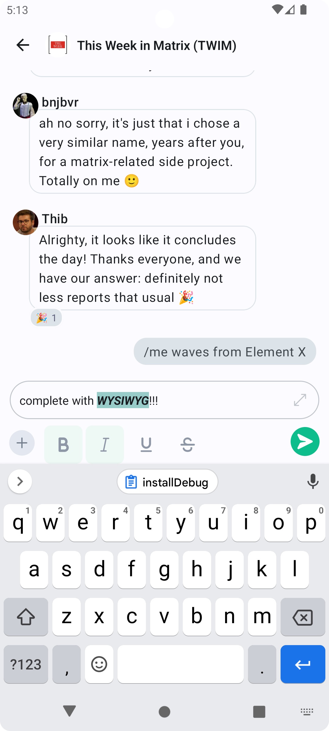 Release candidate 1.5.4 is available for the tester on the PlayStore. It includes a lot of new features, most of them behind lab flags: new device management, new WYSIWYG editor, Voice broadcast, etc. Also the application is now targeting Android 13 devices. Please refer to the full changelog for more details.