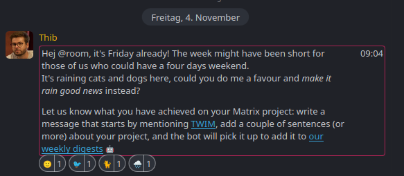And by the way we also added screen-sharing with Element Desktop Nightly using the embedded Element Call.