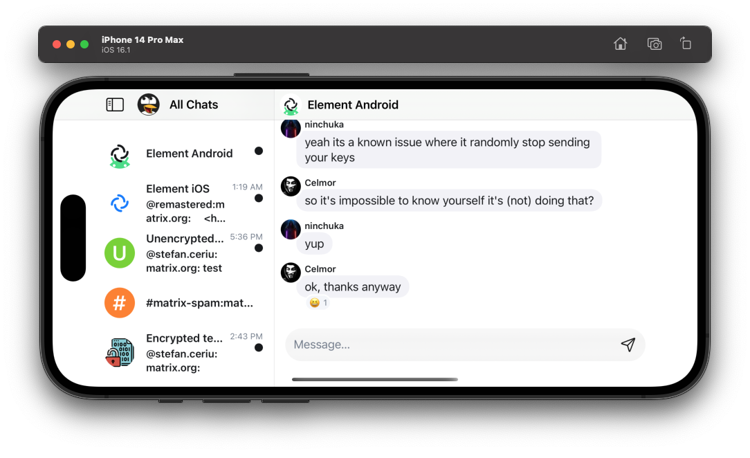 Work on Element X is making great progress, weβre even looking at how to improve the iPad and desktop view for users on larger screens.