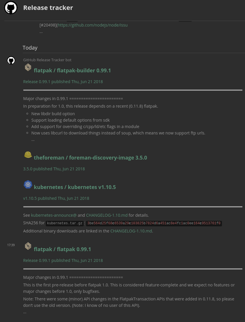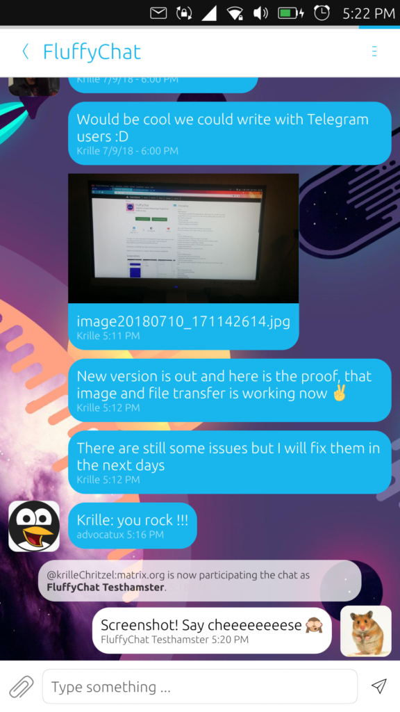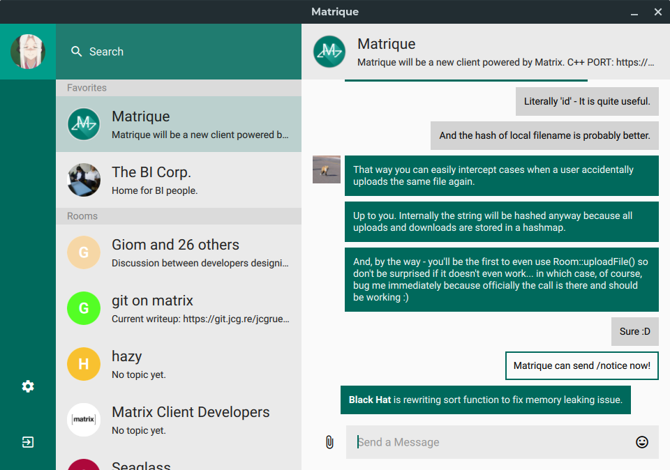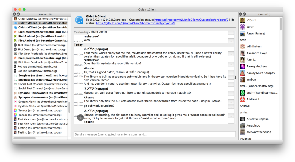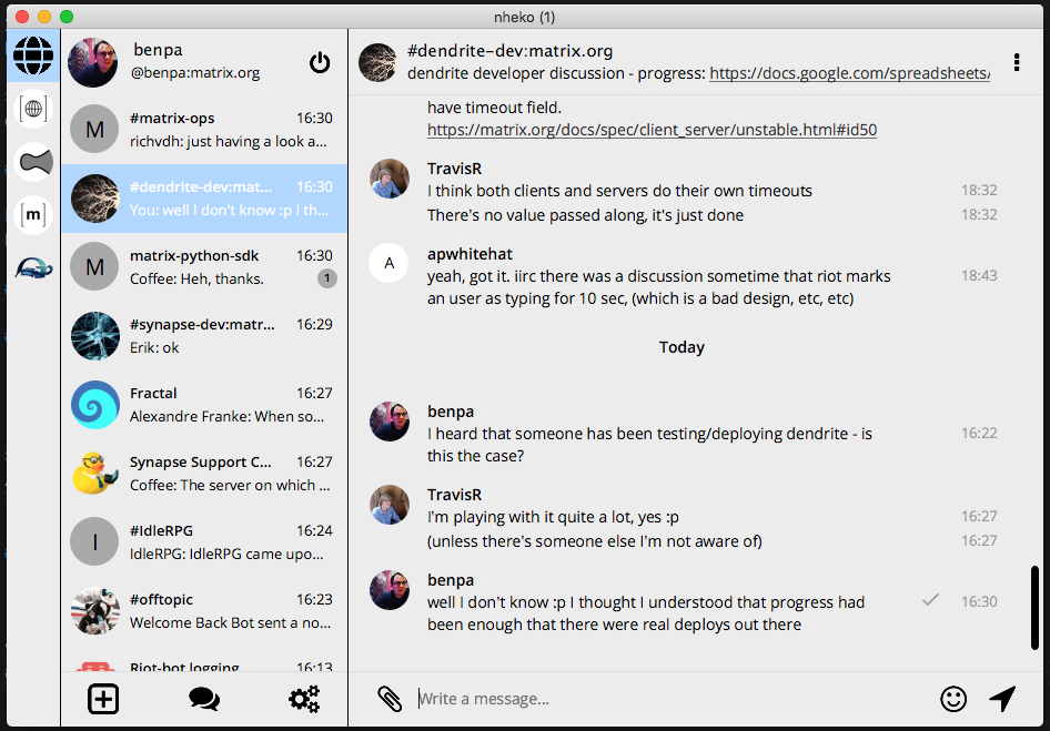 We've also seen some encouraging interest and development work from the community in the past couple months. While PR review from our own side is admittedly slow due to our focus on getting the foundational work in place, that hasn't stopped both old and new developers from sending in PRs and performing code reviews. A huge thank you to everyone involved! From this we've gotten API implementations and application service fixes from @turt2live, an end-to-end encryption implementation from @fadeAce, filtering support from @CromFr, and some PRs and numerous helpful review comments from @krombel.