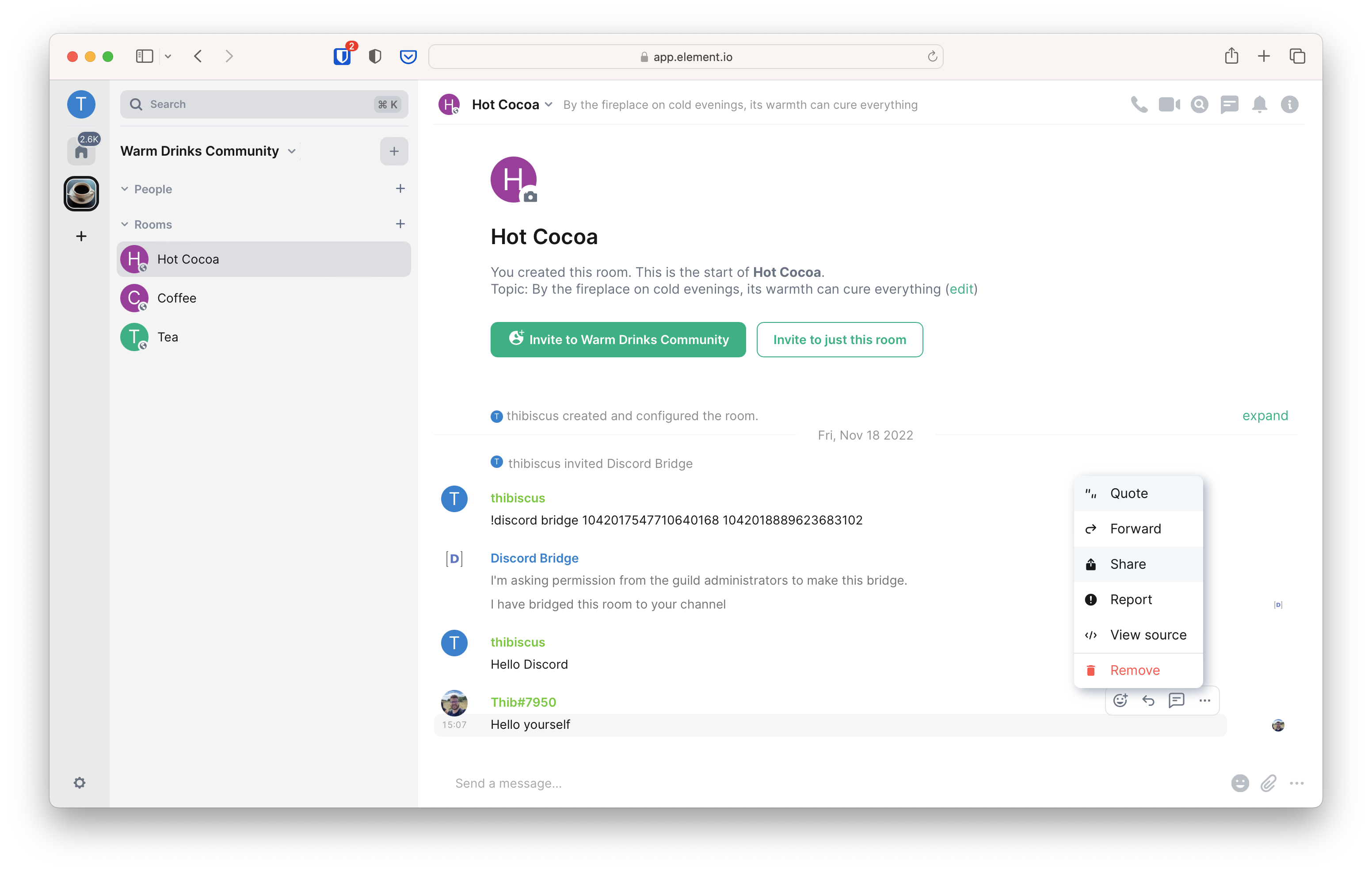 @room. - Administrators can also change the history visibility (whether people can see messages from before they joined or not), enable encryption in the room, remove entire servers from the room, and promote others to Moderator or Administrator.